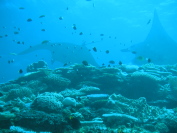 サーフダイブの鈴木さんの案内で場所移動。。 またもや やってきました・・・・いつの間にか3びきが乱舞 マンタはお腹の模様が全部違うので5ひき見たことに。。 海にいた60分間は、ずーとマンタを見ていたのです。 エアー切れで、いよいよお別れ・・・・・・・・