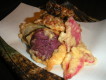 大好きなサラダで、2種類の大根でできています、。 切り干しと生大根、キャベツ、玉葱、色々いれちゃいました。 紫いもがあったので、めずらしく てんぷらにしました。 それと、スープ。。。レモンを入れると、、、変身。。 紫から赤に^^