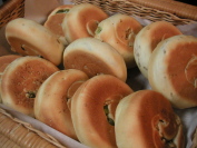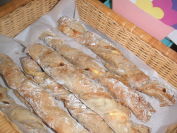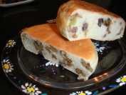 カットするとこの通り。 くるみ、大納言、うぐいすかのこ、がいっぱいはいっています。 甘くなく、人気のあるパンです。 中級コースで登場するパンです。